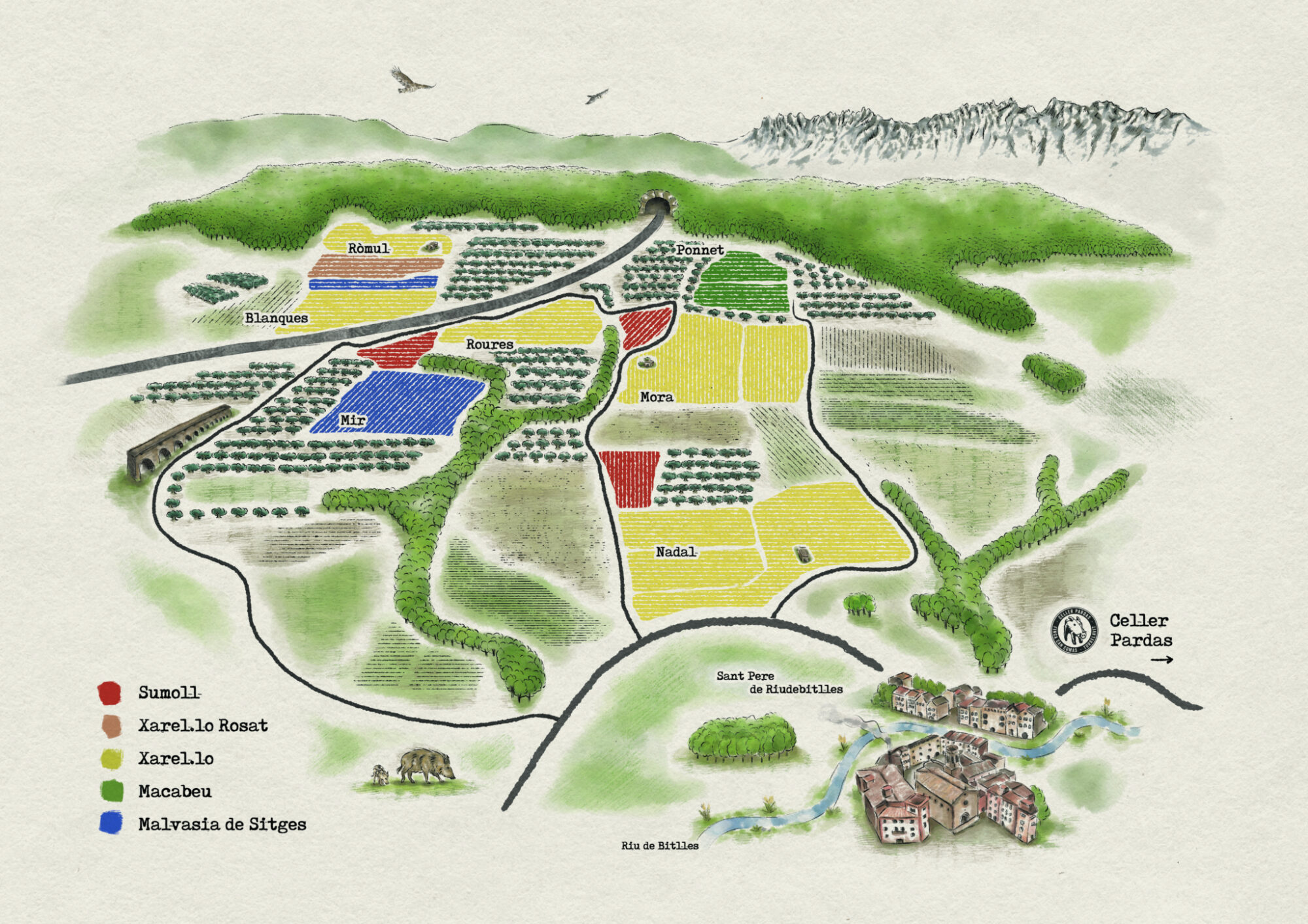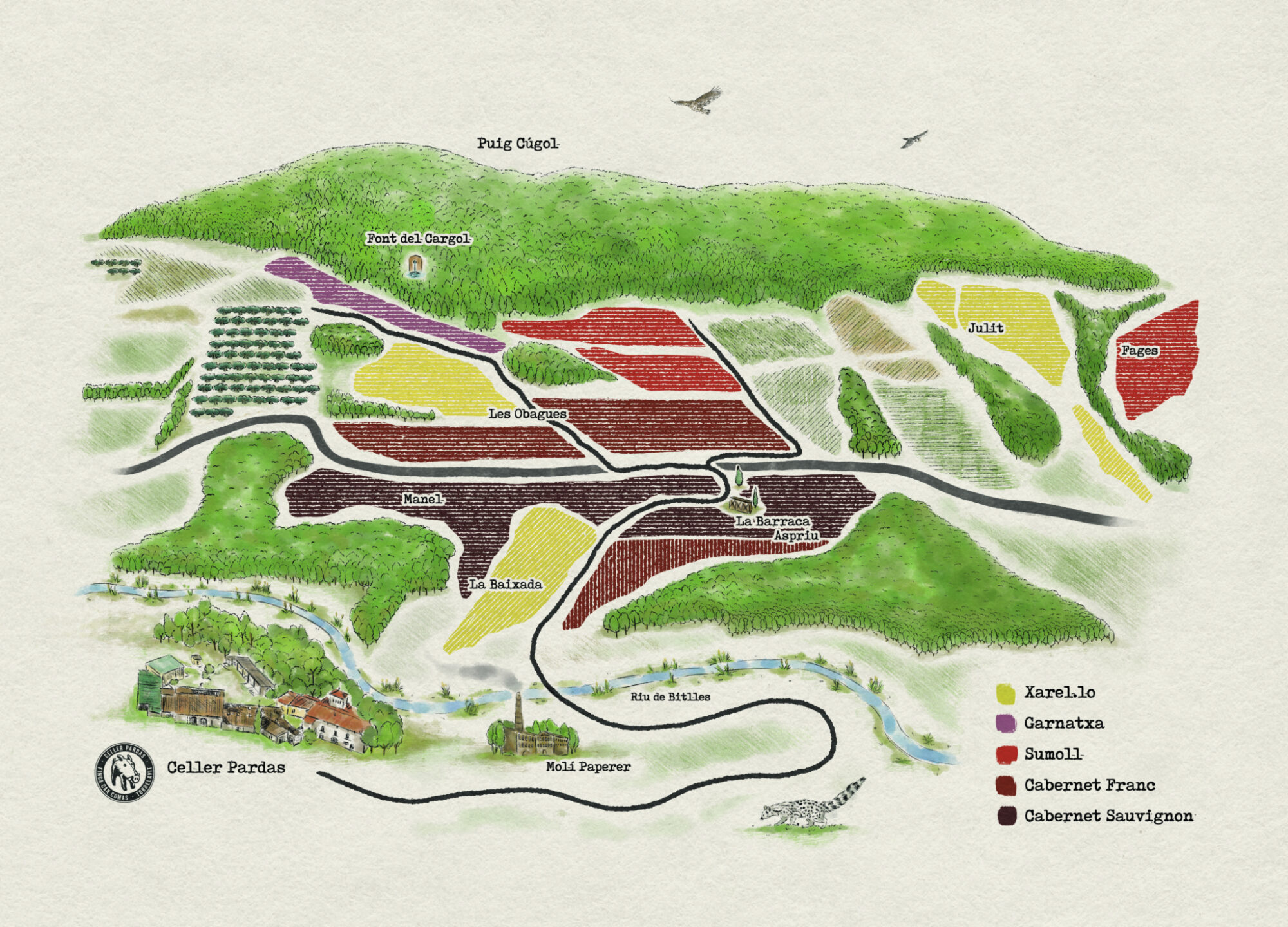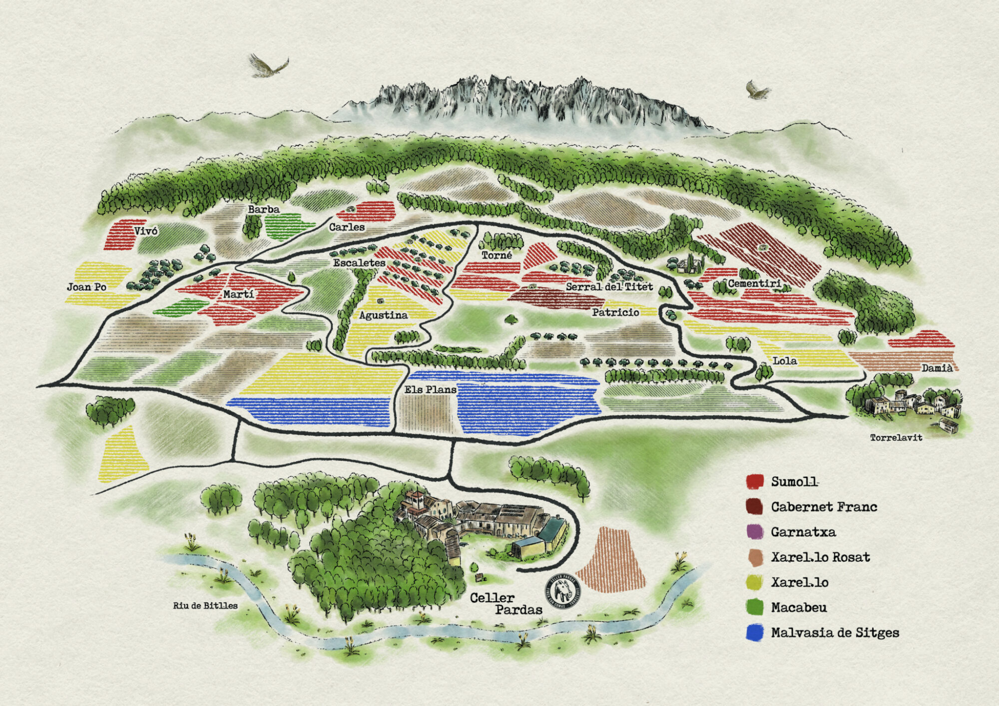 Treballem les vinyes de forma austera, portant a terme una agricultura de conservació de tall radicalment ecològic. Amb el canvi climàtic com a realitat ineludible, amb l’augment de temperatures, les sequeres i cops de calor associats, hem hagut de repensar tota la filosofia a vinya. Res és per sempre: Marcs de plantació més amples s’imposen, porta-empelts més resistents a la sequera, reubicació de les varietats en altres contextos, passar de l'emparrat al vas en algunes varietats. Veurem com va. És un repte incert.